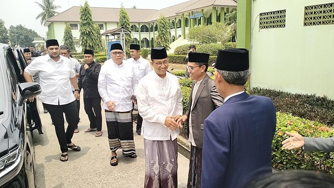 Anies tampak memakai sarung saat tiba di pesantren tersebut. Anies didampingi Wakil Ketua Umum Partai NasDem Ahmad Ali dan Ketua DPW NasDem Banten Wahidin Halim.