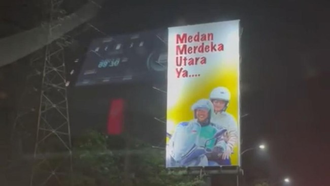 Dalam sebuah video diterima detikcom, Jumat (27/10/2023), baliho itu terpampang di sisi jalan tol. Terlihat Prabowo sedang menumpangi ojek lengkap memakai helm. Di sisi kiri atas terdapat tulisan 'Medan Merdeka Utara Ya'.