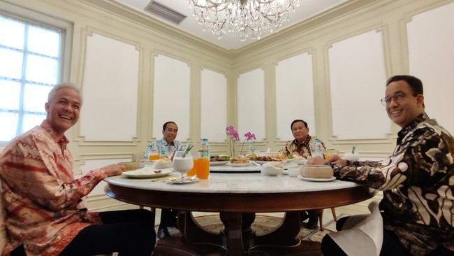 Presiden Joko Widodo (Jokowi) makan siang bersama tiga bakal calon presiden (capres). Tiga bakal capres itu ialah Anies Baswedan, Ganjar Pranowo, dan Prabowo Subianto.