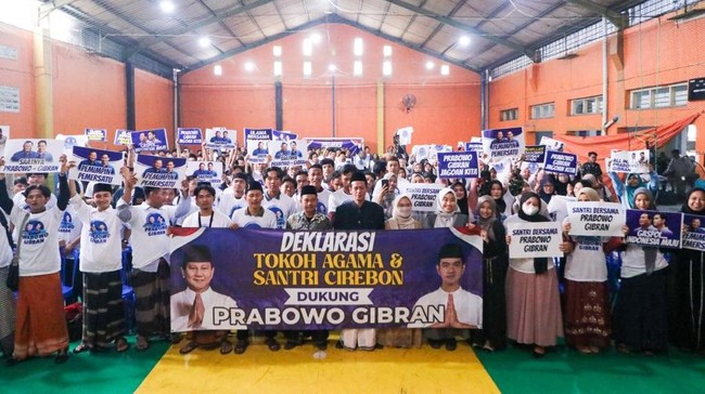 Ustaz dan santri di Cirebon, Jawa Barat (Jabar), mendeklarasikan dukungan untuk duet Prabowo Subianto-Gibran Rakabuming Raka di Pilpres 2024. Mereka berupaya memenangkan pasangan Koalisi Indonesia Maju (KIM) itu.