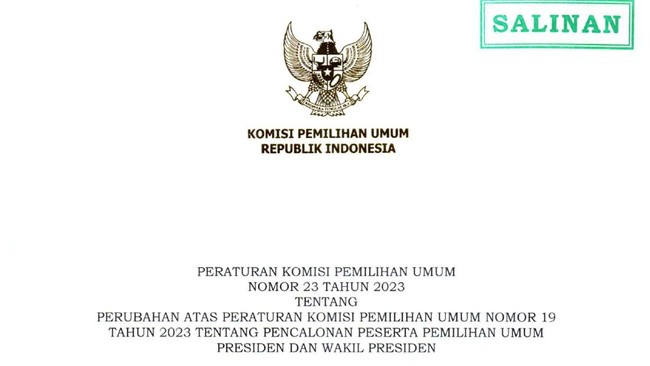 Dengan diberlakukannya Peraturan KPU No. 23 Tahun 2023 tersebut maka mencabut peraturan KPU sebelumnya, yakni PKPU Nomor 19 Tahun 2023 tentang Pencalonan Peserta Pemilihan Umum Presiden dan Wakil Presiden. Berikut informasi selengkapnya: