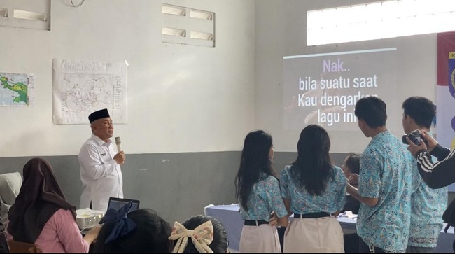 Wali Kota Depok M Idris menghadiri acara sosialisasi dan pendidikan politik bagi pemilih pemula di SMA Kasih Depok, Jawa Barat (Jabar). Idris sempat bernyanyi bersama pelajar saat menyosialisasikan Pemilu 2024.