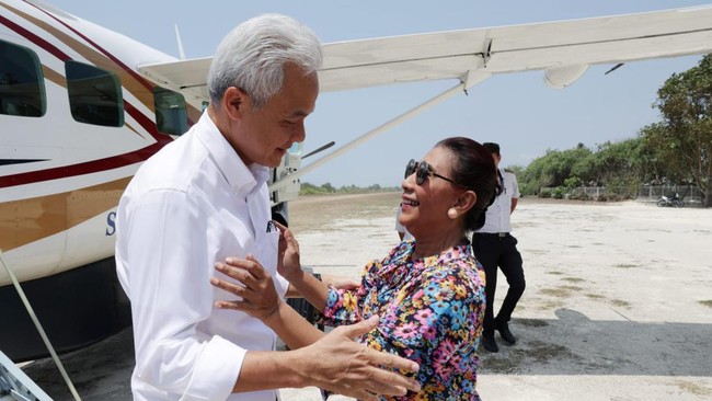 Dalam foto-foto tersebut terlihat Ganjar Pranowo, yang mengenakan kemeja putih panjang dan celana krem, disambut Susi Pudjiastuti di depan pesawat perintis. Ganjar dan Susi bersalaman saat bertemu.