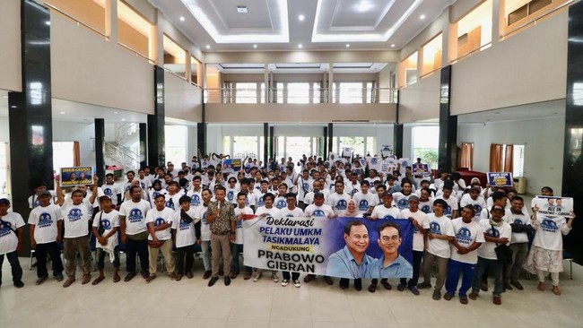 Pelaku UMKM di Kabupaten Tasikmalaya, Jawa Barat (Jabar) mendeklarasikan dukungan untuk pasangan calon presiden (capres) Prabowo Subianto dan calon wakil presiden (cawapres) Gibran Rakabuming Raka. Mereka menilai Prabowo-Gibran melakukan kerja-kerja nyata, termasuk pada sektor UMKM.