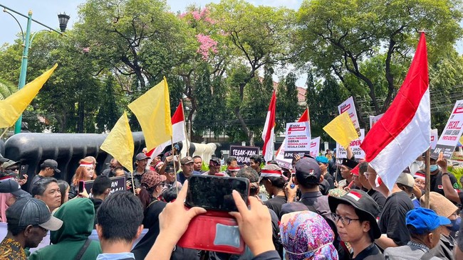 Massa aksi juga membawa sejumlah atribut, seperti poster-poster penolakan, bendera merah putih dan bendera kuning, serta membawa keranda berwarna hitam. Massa aksi itu gabungan dari relawan Ganjar Pranowo, di antaranya Ganjarist, Gerak 98, Seknas Puan, LBH Ganjar Keadilan, Maharani Pejuang Marhaen, GP Mania 2024, GP Center.