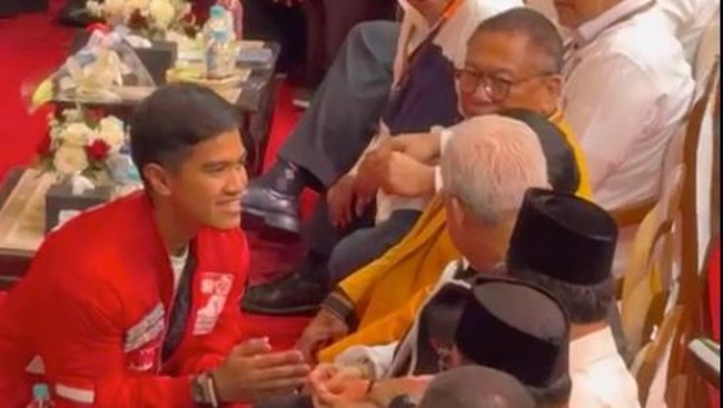 Tidak berselang lama, Kaesang kembali menghampiri Megawati. Di momen ini, Kaesang tampak bersimpuh di depan Megawati. Kesang juga tampak menyampaikan sesuatu ke Megawati.