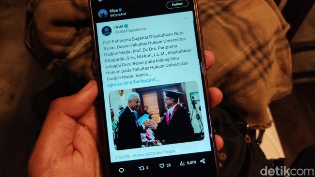 Dilansir detikJogja, Jumat (17/11/2023) awalnya akun resmi media sosial X UGM memposting tautan link berita pengukuhan guru besar hukum dagang Prof Paripurna Sugarda pada Kamis (16/11). Dalam postingan itu memuat foto Ganjar sedang bersalaman dengan Sugarda.
