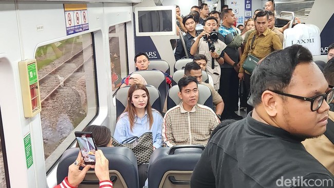 Pantauan detikcom, Sabtu (18/11/2023), Gibran tiba dan mulai menaiki kereta bandara sekitar pukul 17.40 WIB. Gibran pun duduk bersebelahan dengan istrinya, Selvi Ananda.