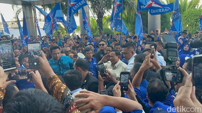 Pantauan detikJatim di lokasi, Prabowo tiba sekitar pukul 15.50 WIB, Senin (20/11/2023). Massa kader Demokrat bersama simpatisan membaur bersama AHY dan SBY. Mereka meneriakkan yel-yel Prabowo-Gibran menang Pilpres 2024 satu putaran.