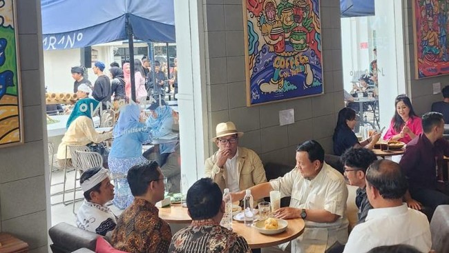 Momen Ridwan Kamil bersama Prabowo di kafe itu diunggah di akun media sosial Ridwan Kamil, seperti dilihat pada Kamis (23/11/2023). Ridwan Kamil dan Prabowo tak hanya berdua, namun turut ditemani Waketum Partai Gerindra Sugiyono dan Wakil Ketua Dewan Pembina Dedi Mulyadi.