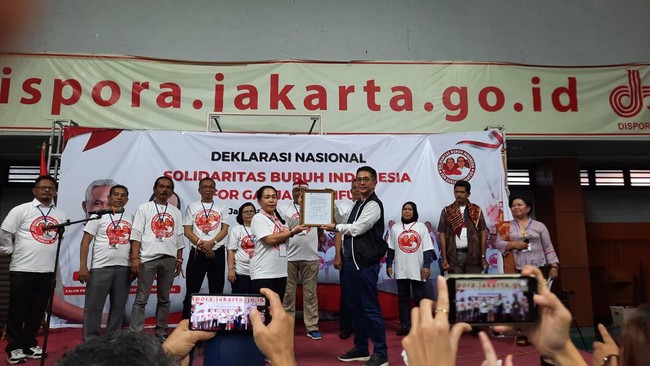 Massa yang mengatasnamakan Solidaritas Buruh Indonesia mendeklarasikan dukungan kepada capres-cawapres nomor urut 3, Ganjar Pranowo dan Mahfud Md. Mereka meyakini Ganjar-Mahfud dapat memperbaiki Undang-Undang Cipta Kerja.