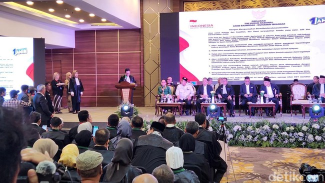 Deklarasi digelar di Swansa Grand Ballroom, Kuningan, Jakarta Selatan, Senin (27/11/2023). Deklarasi itu dibacakan oleh Ketua Dewan Pakar Timnas AMIN Hamdan Zoelva.