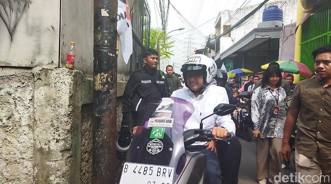 Selanjutnya, Anies terlihat menaiki sepeda motor bersama istrinya, Fery Farhati, untuk mengelilingi Kampung Tanah Merah. Anies bersama Fery kompak mengenakan pakaian serbaputih dengan helm putih bertulisan 'AMIN'.