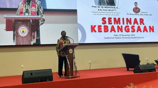 Menko Polhukam Mahfud Md menghadiri acara seminar kebangsaan di Universitas Budi Dharma, Tangerang. Cawapres nomor urut 3 itu menyampaikan kehadiran dirinya bukan untuk berkampanye.
