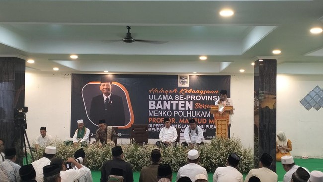 Calon wakil presiden (cawapres) nomor urut 3, Mahfud MD, ceramah kebangsaan di Mathla'ul Anwar Lidahdatil Ulama, Menes, Pandeglang. Di acara yang dihadiri para kiai di Pandeglang itu Mahfud mengajak umat Islam untuk tak menjauhi negara, bahkan harus turut mengurusnya.
