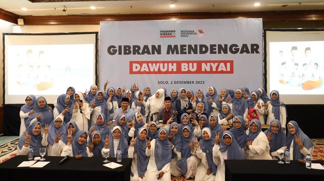 Sebanyak 60 Ibu Nyai (istri pengasuh pondok pesantren) dan Majelis Taklim perwakilan pondok pesantren se-Jawa Tengah bertemu dengan Calon Wakil Presiden (Cawapres) Gibran Rakabuming Raka, di Solo, Jawa Tengah. Wakil Ketua Tim Kampanye Nasional (TKN) Prabowo-Gibran Arifah Choiri Fauzi mengatakan hadirya para Bu Nyai ini adalah bentuk dukungan mereka kepada Prabowo-Gibran.