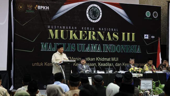 Hal tersebut diungkapkan oleh Prabowo saat menghadiri Musyawarah Kerja Nasional Majelis Ulama Indonesia (MUI) ke-III di Hotel Mercure Ancol, Sabtu (2/12). Hadir Ketua Umum MUI KH Anwar Iskandar, Wakil Ketum KH Marsudi Syuhud, Buya Basri Barmanda dan Sekjen Buya Amirsyah Tambunan.