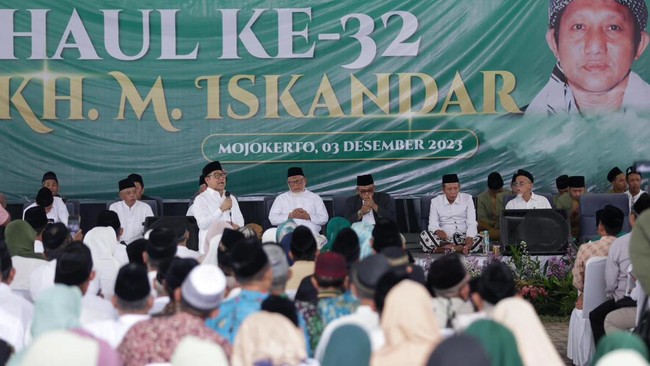 Calon Wakil Presiden (Cawapres) nomor urut 1 Muhaimin Iskandar atau Cak Imin menghadiri haul ke-32 ayahanda, Muhammad Iskandar, di Desa Pugeran, Mojokerto. Cak Imin bersyukur bisa menghadiri haul di tengah kesibukan masa kampanye sebagai Cawapres.