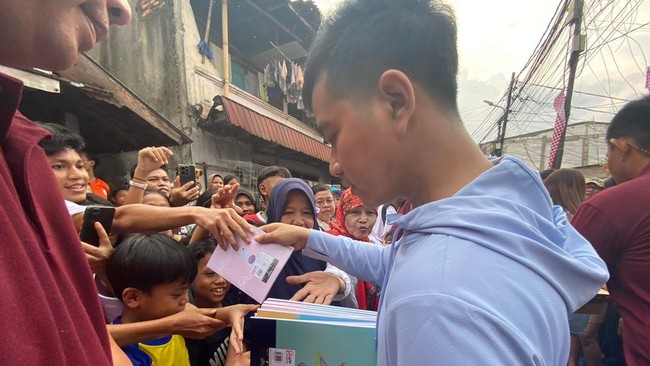 Gibran yang didampingi istrinya Selvi Ananda blusukan ke pemukiman warga. Gibran terlihat membagikan susu dan buku yang juga bagian dari programnya bersama pasangannya, Prabowo Subianto.