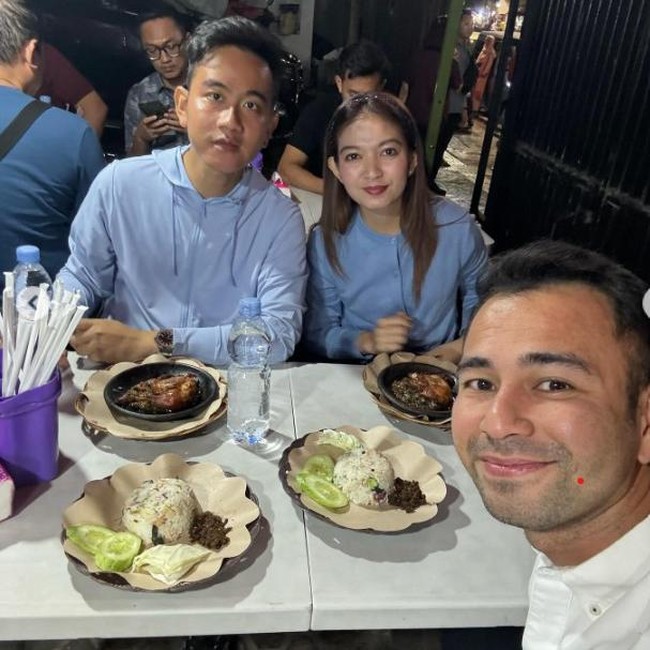 Cawapres nomor urut 2, Gibran Rakabuming Raka dan istrinya, Selvi Ananda, makan bareng dengan artis Raffi Ahmad. Gibran dan Selvi makan di tempat usaha Raffi Ahmad di kawasan Tebet, Jakarta Selatan.
