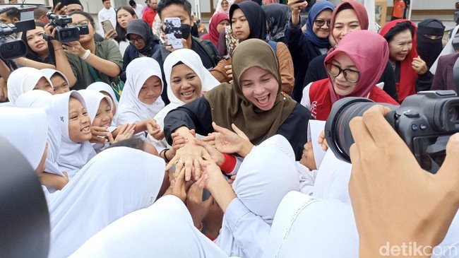 Atikoh pun langsung menjulurkan tangannya kepada anak-anak yang begitu antusias menyambutnya. Dia pun melemparkan senyuman