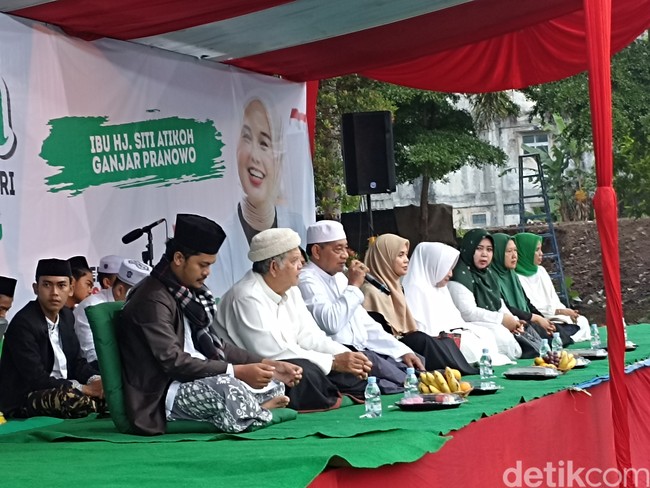Istri calon presiden (capres) nomor urut 3 Ganjar Pranowo, Siti Atikoh, mengikuti doa bersama para kiai, nyai, dan santri Pondok Pesantren Cipasung, Tasikmalaya. Dalam kesempatan itu, pimpinan ponpes Ubaidillah Ruhiat mendoakan agar suami Atikoh menjadi Presiden lewat Pilpres 2024 mendatang.
