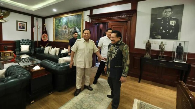 Terdapat beberapa foto dalam unggahan itu. Pada foto pertama, terlihat Prabowo menyambut hangat Hendropriyono di ruang kerjanya.