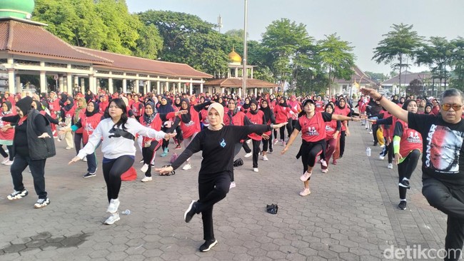 Istri dari capres nomor urut 3 Ganjar Pranowo, Siti Atikoh Ganjar, melakukan senam bersama emak-emak di Alun-alun Kota Serang. Senam diikuti peserta dari pendukung dan warga lain yang berolahraga di pusat ibu kota Banten ini.