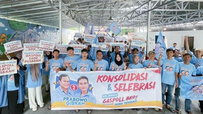 "Setulus hati membentuk Relawan Gaspoll Bro Jawa Tengah untuk memenangkan Prabowo-Gibran dalam satu putaran pada Pilpres 2024," kata Koordinator Gaspoll Bro Jateng, Zaenal Arifin dalam keterangannya, Senin (11/12/2023).