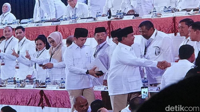 Prabowo mengenakan seragam kemeja putih dan peci hitam. Dia menyalami para kader dan petinggi partai yang kursinya berada di atas panggung, di antaranya Wakil Ketua Dewan Pembina Hashim Djojohadikusumo, Wakil Ketua Dewan Pembina Mochamad Iriawan atau Iwan Bule, Waketum Gerindra Rahayu Saraswati Djojohadikusumo, dan Waketum Gerindra Budisatrio Djiwandono.