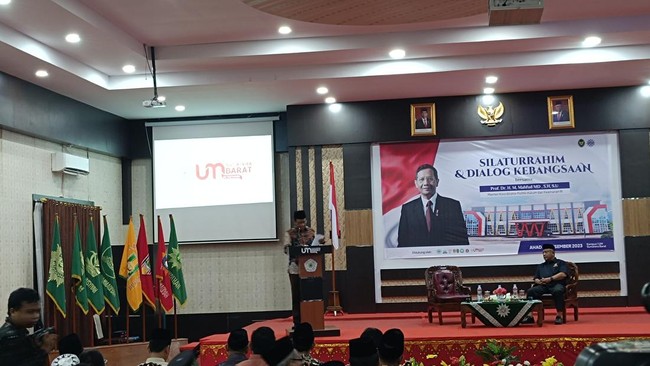 Menteri Koordinator Poltik Hukum dan Keamanan (Menko Polhukam) yang juga cawapres nomor urut 3, Mahfud Md, memberi sambutan dalam dialog di Universitas Muhammadyah Sumatra Barat, Kota Padang. Dia menyampaikan bahwa aspek politik dan keamanan (polkam) di Indonesia cukup baik.