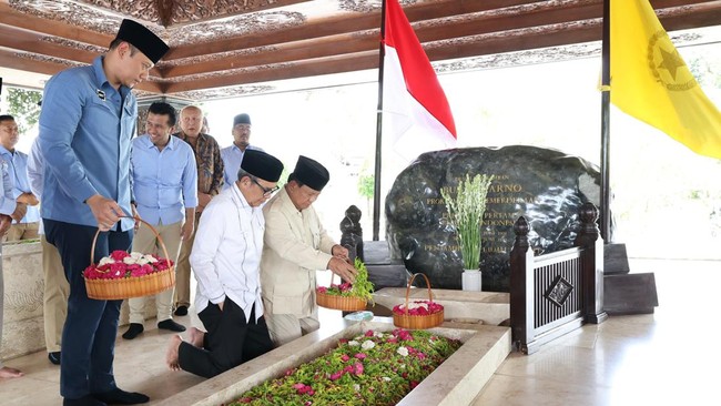 Ziarah makam AHY dan Prabowo dilakukan pada Minggu (17/12) siang. Di depan makam Bung Karno, AHY, Prabowo, dan rombongan melantunkan doa secara khusyuk.
