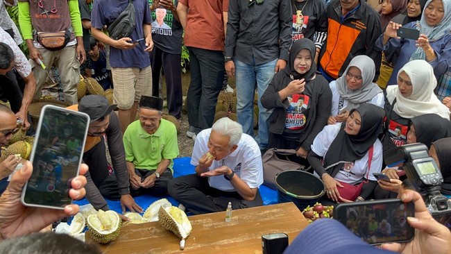 Capres nomor urut 3 Ganjar Pranowo berkunjung dan menikmati durian di Desa Wilayu, Selomerto, Wonosobo, Jawa Tengah. Ganjar mengaku ingin menjadikan desa tersebut sebagai desa wisata durian.