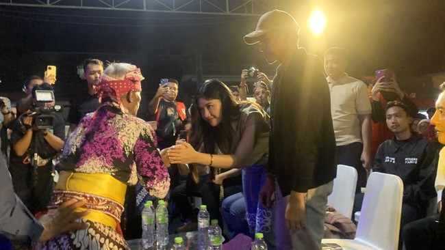 Kaesang dan Erina juga membelikan jajanan telur gulung untuk anak-anak kecil di lokasi tersebut. Kemudian, mereka juga melayani warga yang meminta foto bersama.