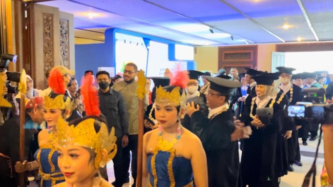 Ganjar kemudian menghampiri Pratikno yang tampak mengenakan toga. Pratikno merupakan Guru Besar UGM.