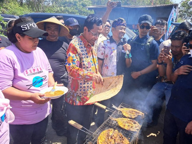 Menko Polhukam Mahfud Md mendatangi permukiman nelayan di Marunda, Cilincing, Jakarta Utara (Jakut). Mahfud bersama warga menyantap ikan laut.