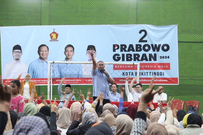 Ketua Tim Kampanye Daerah (TKD) Prabowo Subianto-Gibran Rakabuming Raka Sumatera Barat, Andre Rosiade berkampanye di Kota Bukittinggi, Rabu (20/12/2023). Kegiatan kampanye ini digelar di dua titik lokasi, yakni Guguk Panjang dan Mandiangin, pun dipadati ribuan orang.