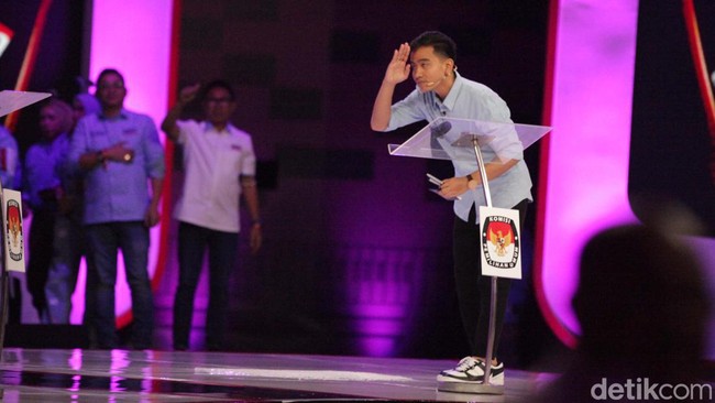 Cawapres nomor urut 2 Gibran Rakabuming Raka menanggapi cawapres nomor urut 1 Muhaimin Iskandar atau Cak Imin dan cawapres nomor urut 3 Mahfud Md. Usai memberikan tanggapannya, Gibran membungkuk ke arah Cak Imin dan Mahfud.