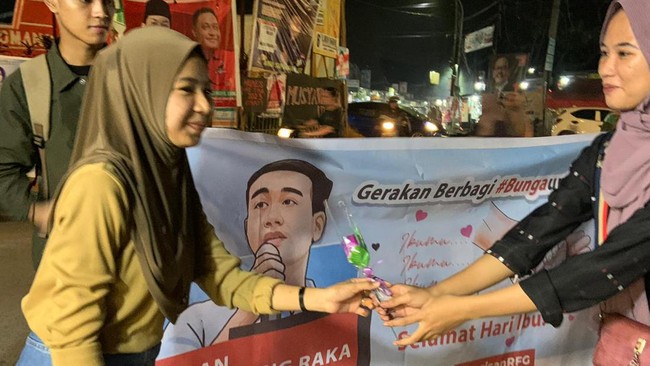 Barisan Relawan For Gibran (RFG) Sulawesi Selatan (Sulsel) memperingati Hari Ibu dengan membagi-bagikan bunga kepada para ibu yang ditemui. Aksi ini dilakukan di beberapa kampus dan jalan raya di kota Makassar dan Gowa.