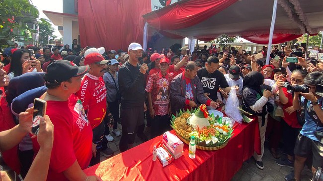 Kedatangan Ganjar disambut oleh Ketua DPC PDIP Kota Solo FX Hadi Rudyatmo atau FX Rudy. Mereka terlihat memotong tumpeng sebagai prosesi peresmian posko. Setelahnya mereka masuk untuk meninjau posko tersebut.