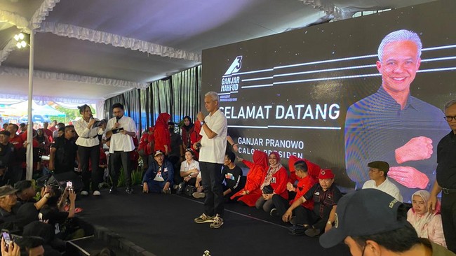 Ganjar tampak didampingi Bupati Sukoharjo Etik Suryani hingga Ketua Tim Penjadwalan TPN Ganjar-Mahfud Aria Bima. Sejumlah politisi dari partai koalisi pengusung Ganjar-Mahfud pun hadir. Ganjar disambut relawan hingga kader yang sebelumnya sudah hadir di lokasi.