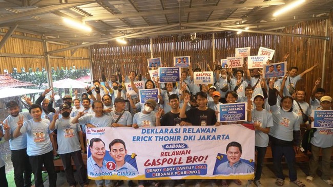 Sejumlah relawan Erick Thohir di DKI Jakarta menyatakan dukungannya untuk Prabowo-Gibran di Pilpres 2024. Para relawan ini juga memutuskan untuk bergabung bersama relawan Gemoy, Asoy, Santuy Poll Bersama Prabowo (Gaspoll Bro).