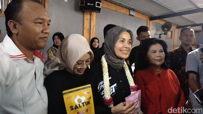 Pantauan detikcom di Jl. Griya Mutiara Asri I No.1, Griya Prajamukti, Kalisapu, Kecamatan Slawi, Kabupaten Tegal, Jawa Tengah, Jumat (29/12/2023), saat tiba, Atikoh disambut dengan pengalungan bunga. Atikoh lalu mendatangi pegiat UMKM.
