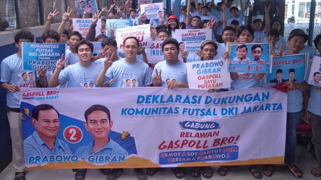 Komunitas futsal di Jakarta menyatakan dukungan kepada paslon nomor urut 2 Prabowo Subianto-Gibran Rakabuming Raka di Pilpres 2024. Mereka akhirnya bergabung Relawan Gemoy, Asoy, Santuy Poll Bersama Prabowo (Gaspoll Bro).
