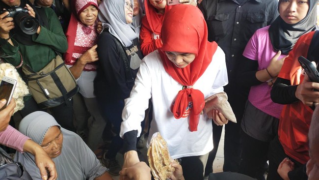 Sesampainya di pasar, ia langsung menghampiri pedagang peyek. Atikoh pun langsung memborong peyek tersebut lalu membagikannya pada warga yang ada di lokasi.