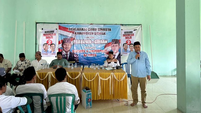 Ketua Tim Kampanye Daerah (TKD) Prabowo Gibran Kabupaten Demak, Maskuri yang hadir di acara tersebut mengatakan dukungan para guru swasta dilakukan secara mandiri untuk menyuarakan kemenangan Prabowo-Gibran.
