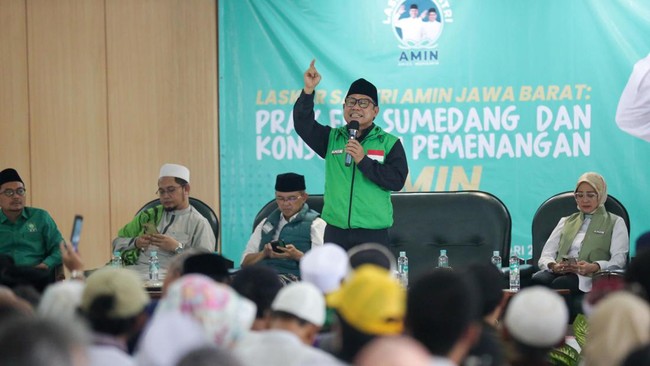 Cawapres nomor 1 Muhaimin Iskandar atau Cak Imin menerima deklarasi dukungan dari Laskar Santri AMIN Jawa Barat di Kota Sumedang. Deklarasi dukungan ini dilakukan di Islamic Center, Sumedang.