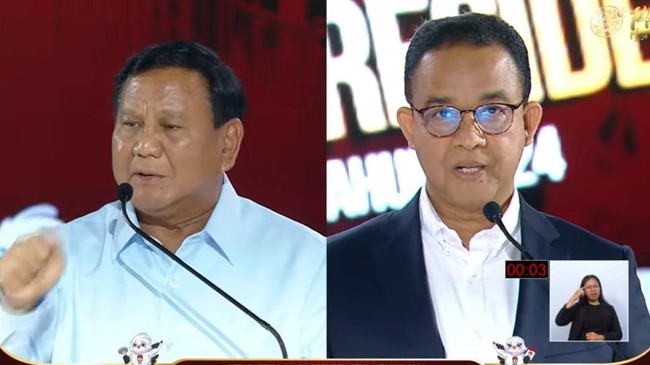 Capres nomor urut 2 Prabowo Subianto menjawab capres nomor urut 1 Anies Baswedan setelah diminta buka-bukaan soal pertahanan di Indonesia. Prabowo mempertanyakan kecintaan Anies terhadap RI.