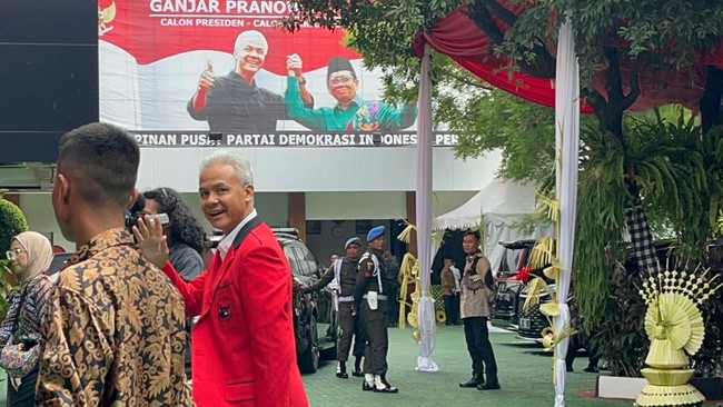 Capres nomor urut 3 Ganjar Pranowo tiba di Sekolah Partai PDIP, Lenteng Agung, Jakarta Selatan. Ganjar menghadiri peringatan HUT ke-51 PDIP.