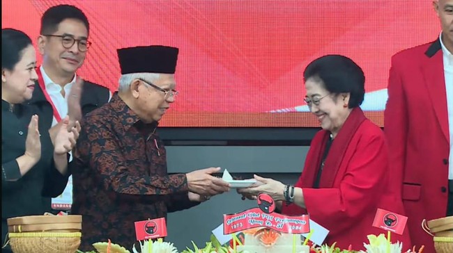 Wapres Ma'ruf Amin menerima potongan tumpeng pertama dari Ketum PDIP Megawati Soekarnoputri. Potongan tumpeng pertama yang diterima Ma'ruf itu dalam momen HUT ke-51 PDIP.